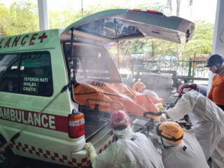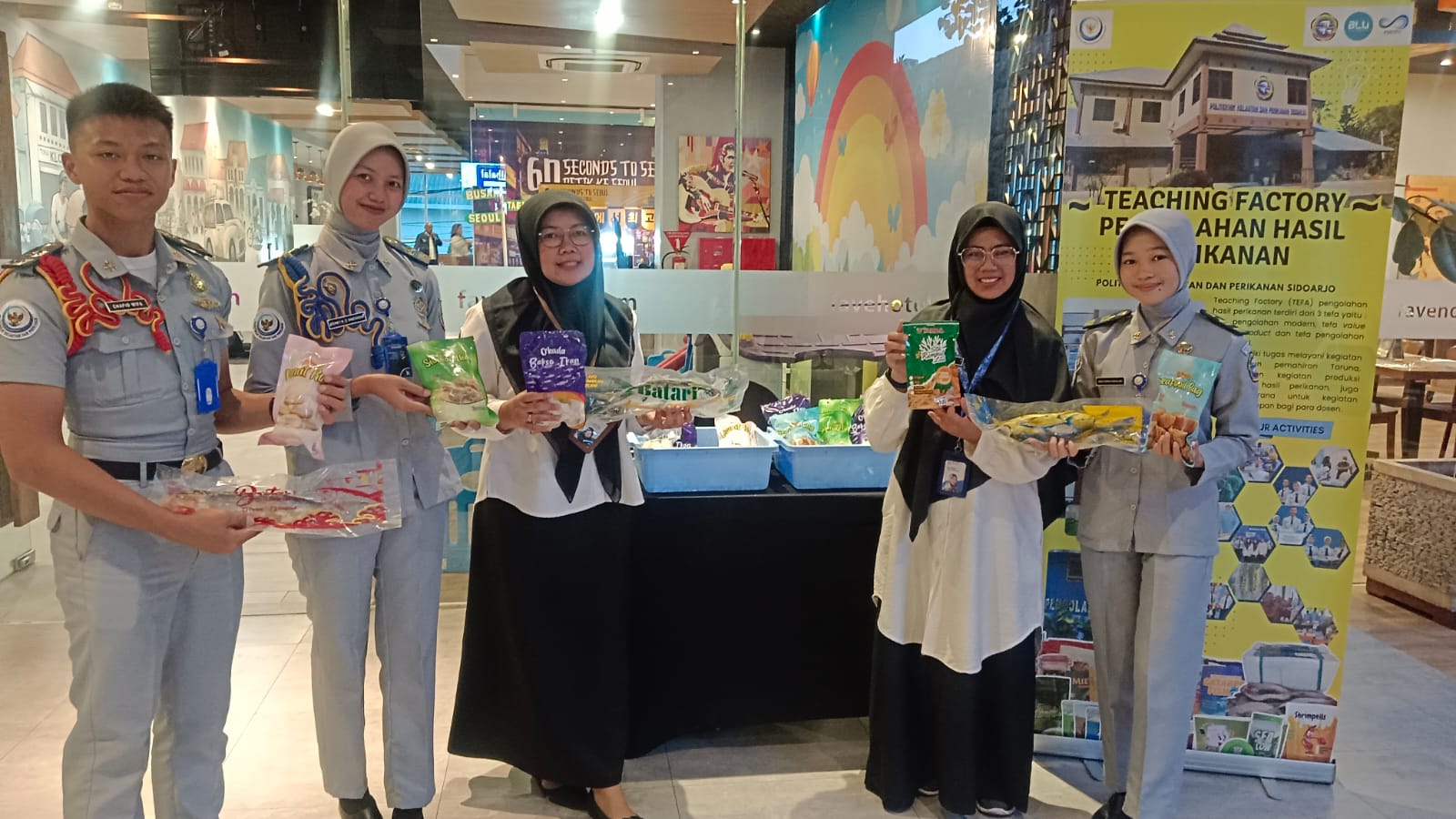 Yus Isnainita (3 dari kiri) bersama dosen pembimbing dan para taruna taruni Politeknik Kelautan dan Perikanan Sidoarjo sedang memamerkan produk unggulan yang dipasarkan pada kegiatan Halbil BPC HIPMI Sidoarjo di Fave Hotel Sidoarjo, Rabu (15/4/2026). Doc : Siska PrestiwatiSidoarjo (Aksaraindonesia.id) – Politeknik Kelautan dan Perikanan (KP) Sidoarjo terus mendorong kemampuan pemasaran para taruna-taruninya. Salah satunya melalui keikutsertaan mereka dalam Badan Pengurus Cabang Himpunan Pengusaha Muda Indonesia (BPC HIPMI) Perguruan Tinggi (PT) Sidoarjo.