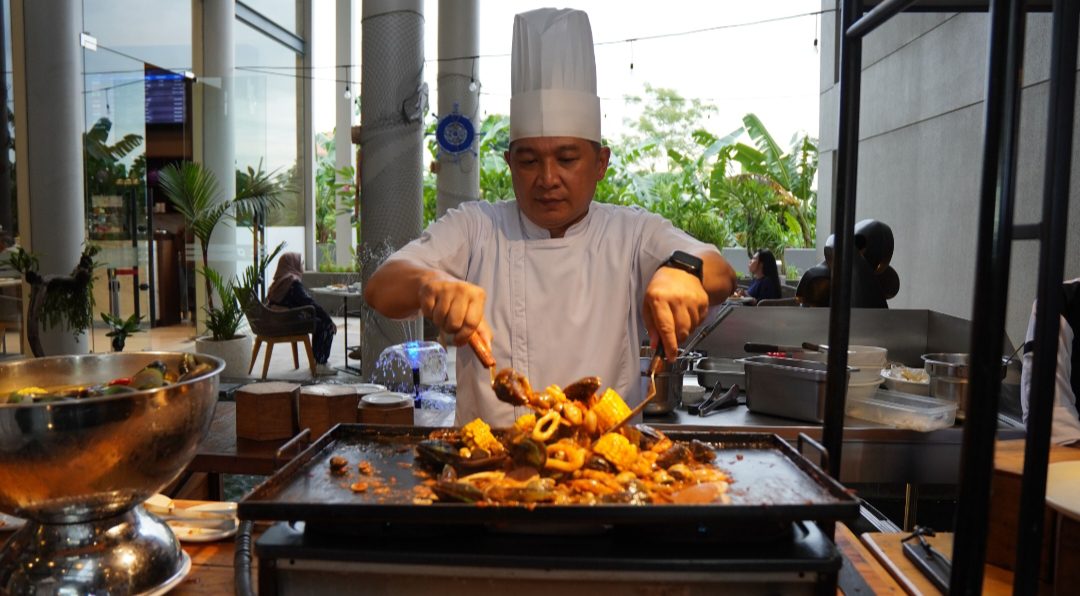Tak jauh dari area live cooking, tersedia buffet “Etalase Berkah Nusantara” dengan lebih dari 70 varian hidangan. Mulai dari Ikan Asam Pedas, Lorjuk, Kerang, Rendang Daging Kentang, Tongseng Daging, Kalio Daging, Ayam Goreng Serundeng, hingga Sayur Lodeh Jadul, Plecing Kangkung, Urap Sayur, dan Gulai Nangka.