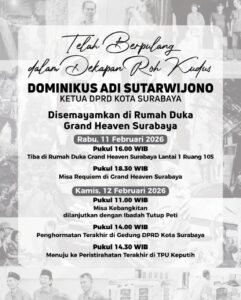 Surabaya (Aksaraindonesia.id) – Kabar meninggalnya Ketua DPRD Surabaya, Dominikus Adi Sutarwijono, pada Selasa (10/2/2026) pukul 20.36 WIB di RS MRCCC Jakarta memang sangat mengejutkan. Kabar duka ini ditanggapi dengan belasungkawa mendalam dari jajaran PDI Perjuangan Surabaya.