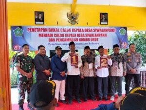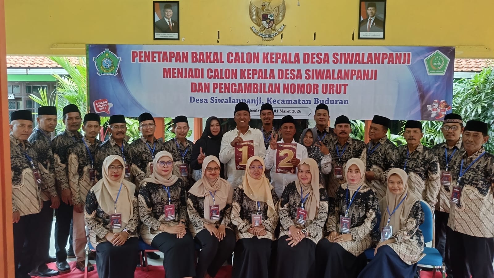 Dua calon kepala desa (cakades) bersama panitia Pilkades Desa Siwalan Panji Sidoarjo usai acara pengundian nomor urut calon. Minggu (1/3/2026). Doc : Siska PrestiwatiSidoarjo (Aksaraindonesia.id) – Proses pengundian nomor urut Calon Kepala Desa (Cakades) Siwalanpanji, Kecamatan Buduran, berlangsung dalam suasana guyub dan penuh kekeluargaan. Kegiatan yang digelar di Balai Desa Siwalanpanji pada Minggu (1/3/2026) siang itu berjalan aman, tertib, dan disambut hangat oleh para calon beserta pendukung masing-masing.