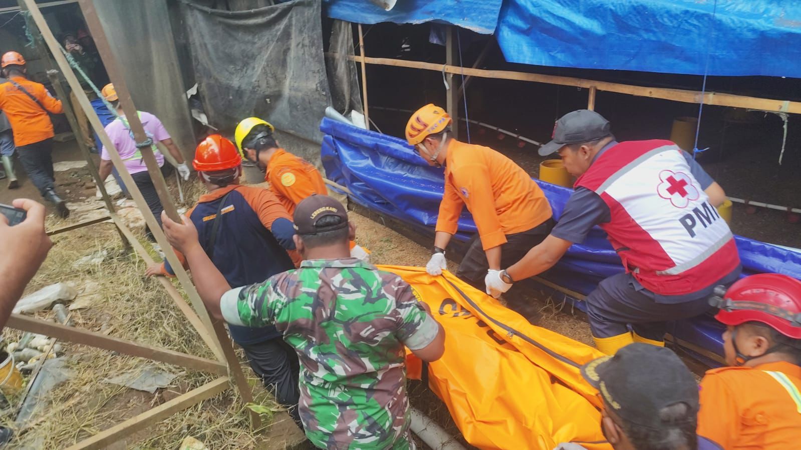 Dalam proses evakuasi korban, tim SAR gabungan menggunakan peralatan ekstrikasi untuk memotong rangka kandang yang menindih korban. Pembongkaran dilakukan hati-hati demi keselamatan petugas dan kelancaran evakuasi.